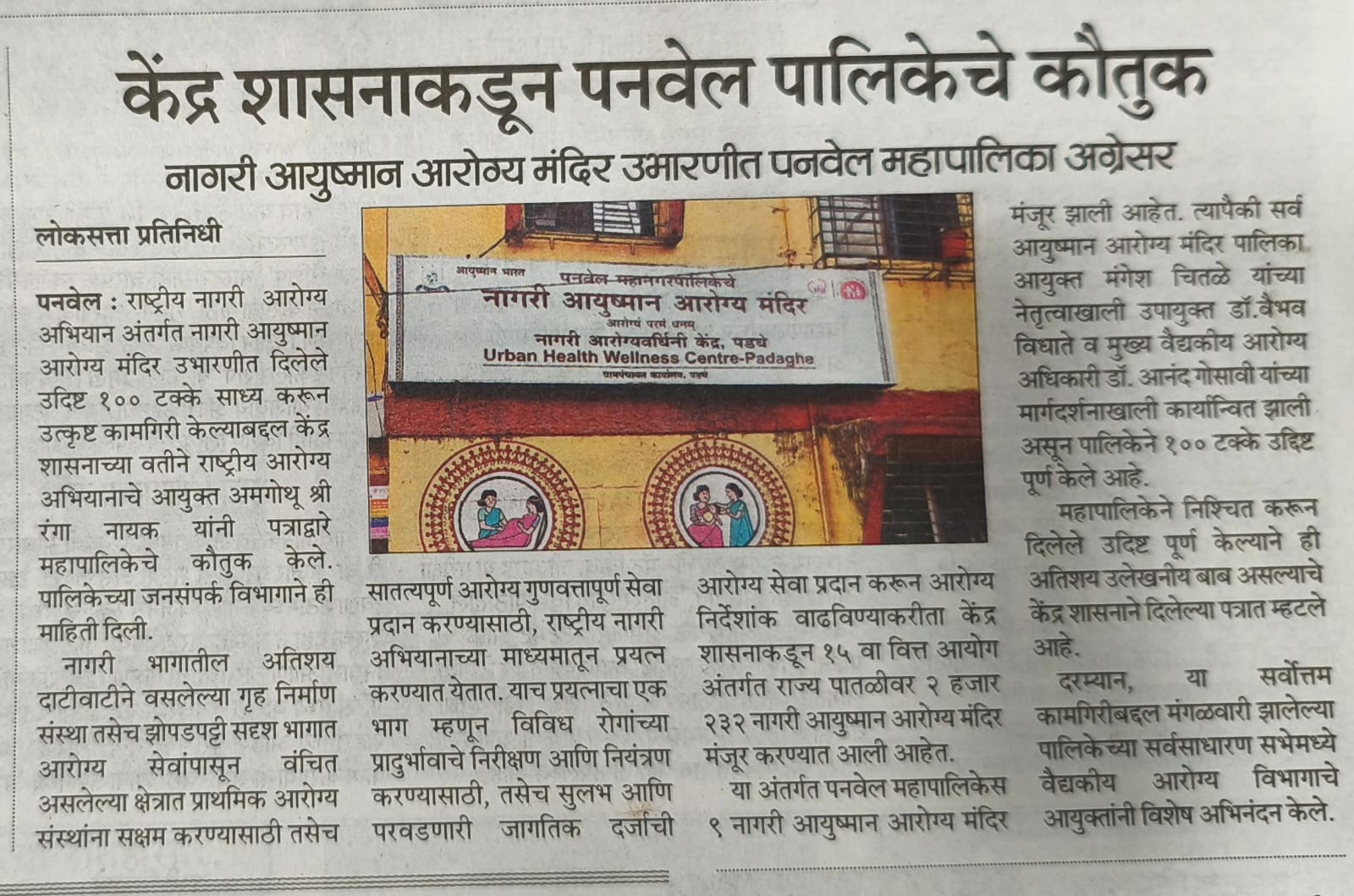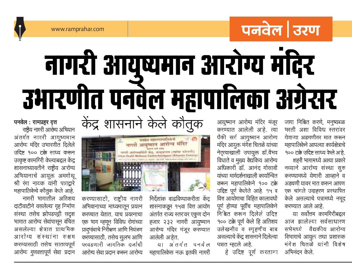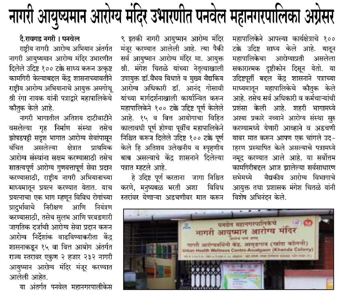 नागरी आयुष्यमान आरोग्य मंदिर उभारणीत पनवेल महानगरपालिका अग्रेसर केंद्र शासनाने केले कौतुक