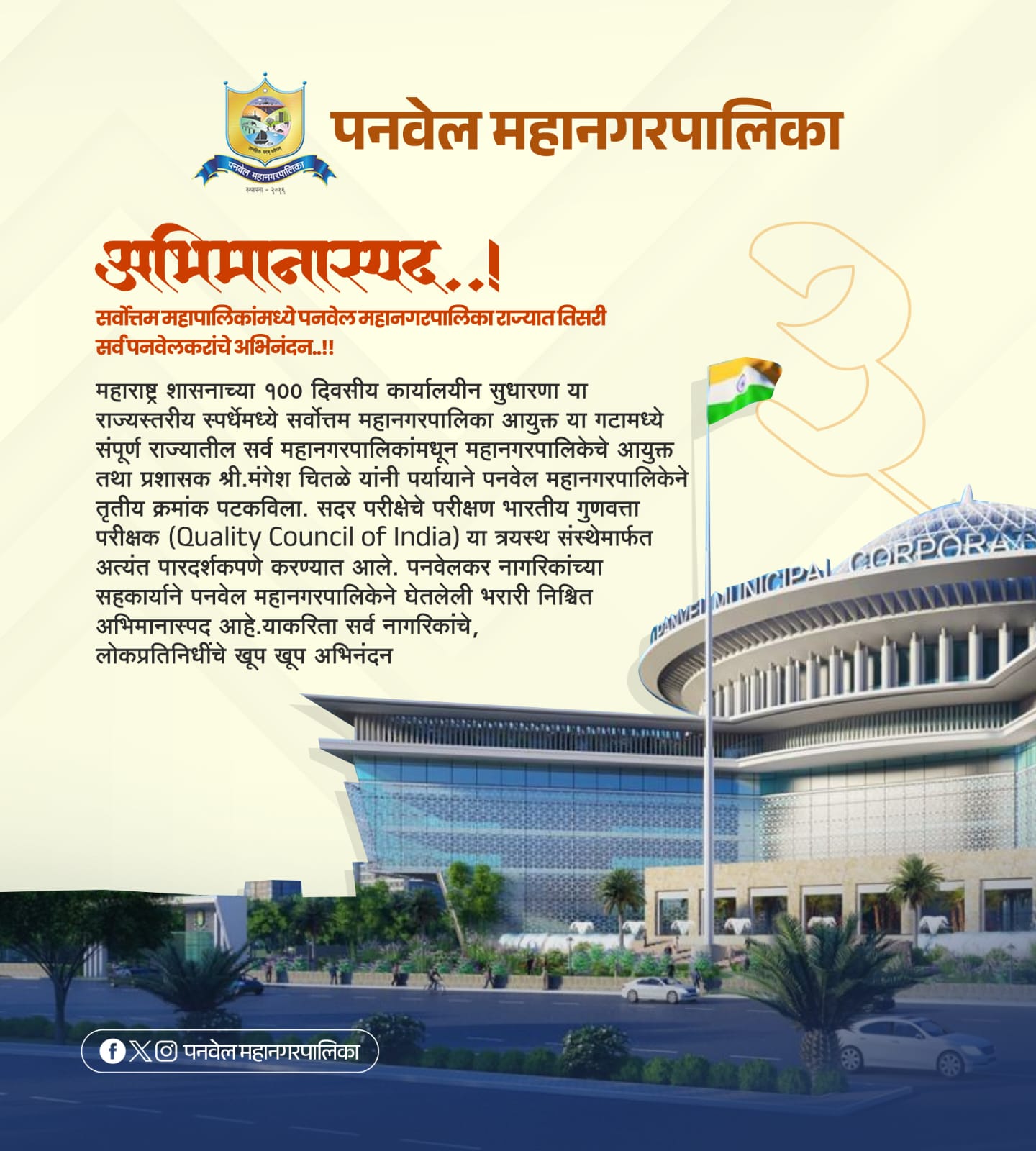 सर्वोत्तम महापालिकांमध्ये पनवेल महानगरपालिका राज्यातील सर्व पनवेलकर यांचे अभिनंदन
